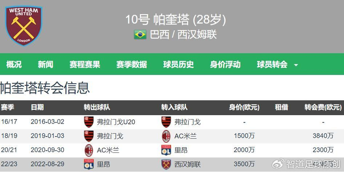 来自天空体育首席记者Kaveh Solhekol的最新报道,帕奎塔从西汉姆联加盟弗拉门戈的交易已经达成口头协议,这笔交易的转会费高达3580万欧元,约4125万欧元(不含浮动部分,部分是分期支付),高于球员在德转的身价3500万欧元。未来24小时之内,帕奎塔将会签署书面合同,这位巴西进攻型中场也即将回归巴甲加盟弗拉门戈,备战今年夏天进行的美加墨世界杯。