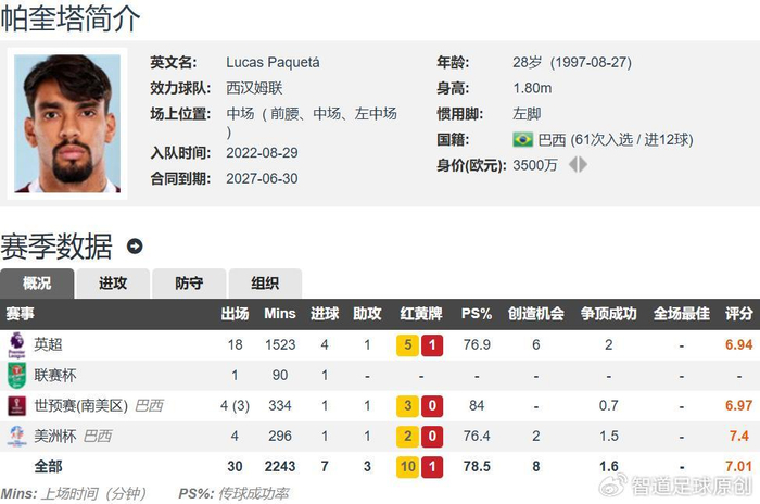 现年28岁的帕奎塔,对于现代球员而言就是当打之年,最好的年华。帕奎塔身高1.80米,左脚球员,主打前腰位置,也可以踢中场和左中场,现有合同至2027年,本赛季英超出场18次,全部首发,共和县4球1助;联赛杯出场1次,打入1球。