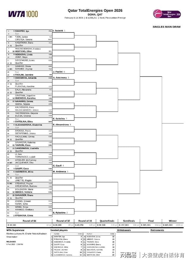 新赛季首项大戏、澳网正式落下帷幕,经过短暂休整,WTA首项1000级巡回赛、多哈巡回赛即将开启。