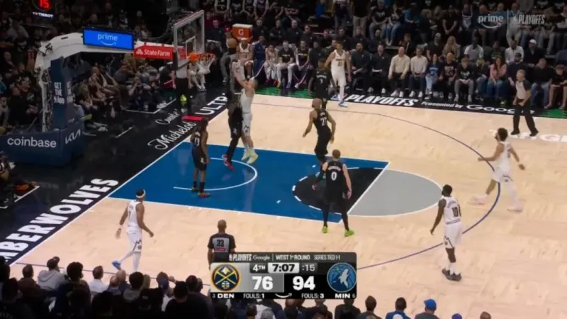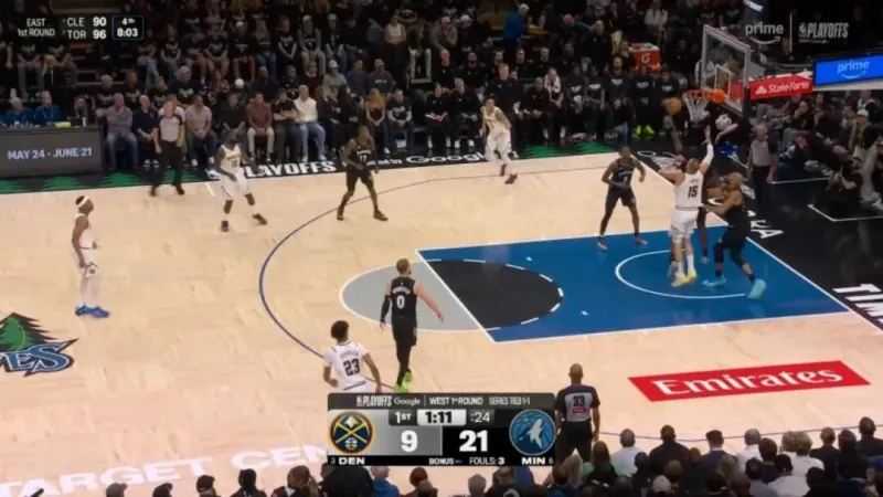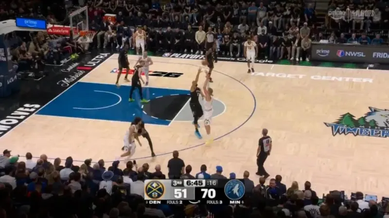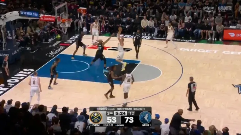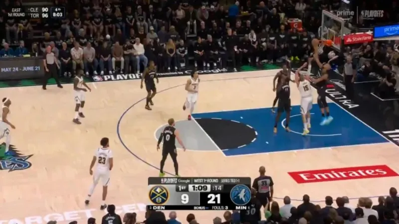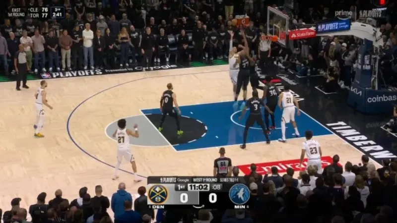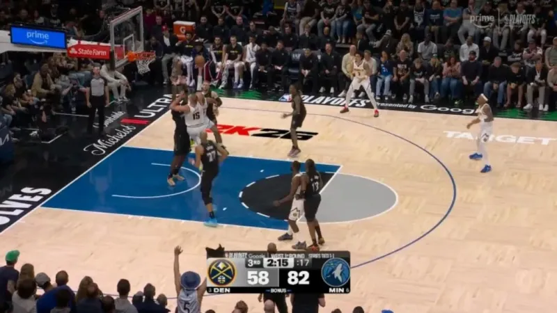 ——开局没多久的一次进攻,约基奇错位打爱德华兹,戈贝尔协防,被干扰的约基奇抛投出手都向后了,打铁偏出