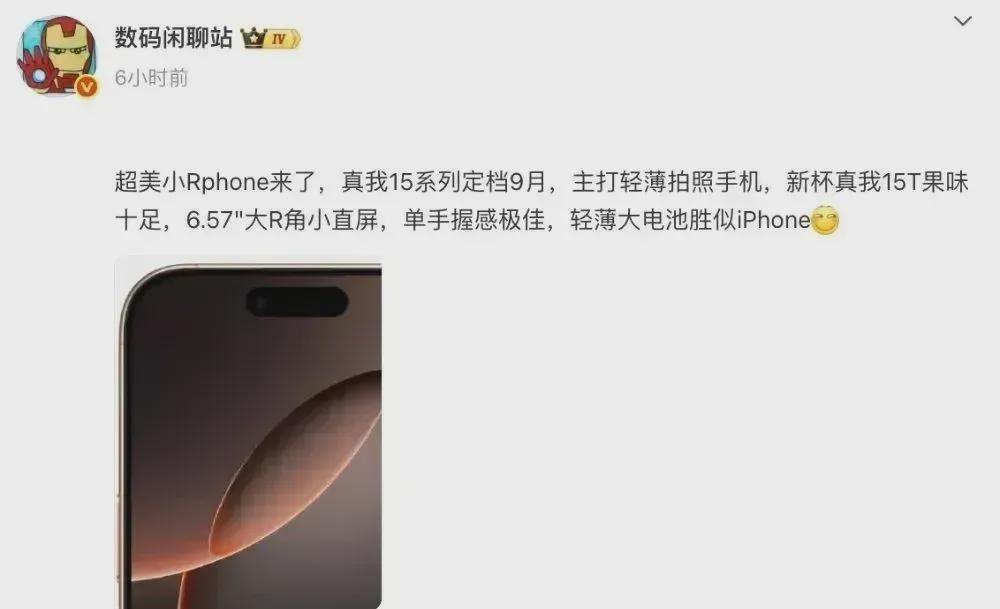 设计向iPhone靠拢:爆料称真我15T将采用6.57英寸小直屏,大R角设计,单手握感极佳,果味十足。